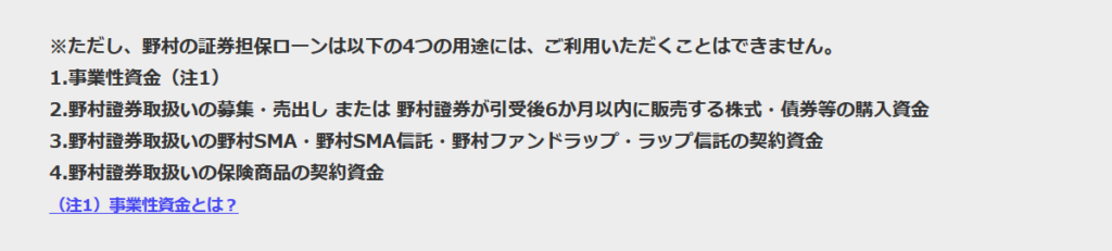 ローン手続きの途中で散々警告を受けますが、以下の資金用途に活用することはできません。今回は念のため野村證券内での投資には使いませんでしたが、おそらく野村證券の投資信託や個別銘柄(内外含む)への投資は問題なさそうです。