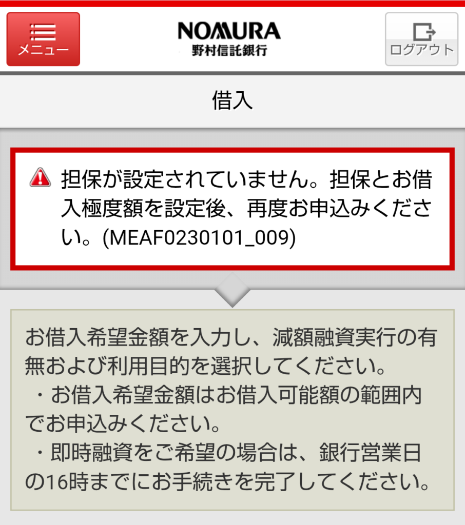 ちなみに担保設定しないで「借入」を行おうとすると以下のエラーメッセージが表示されます。担保設定はもちろん、「借入極度額」を設定することを忘れずに行ってください。