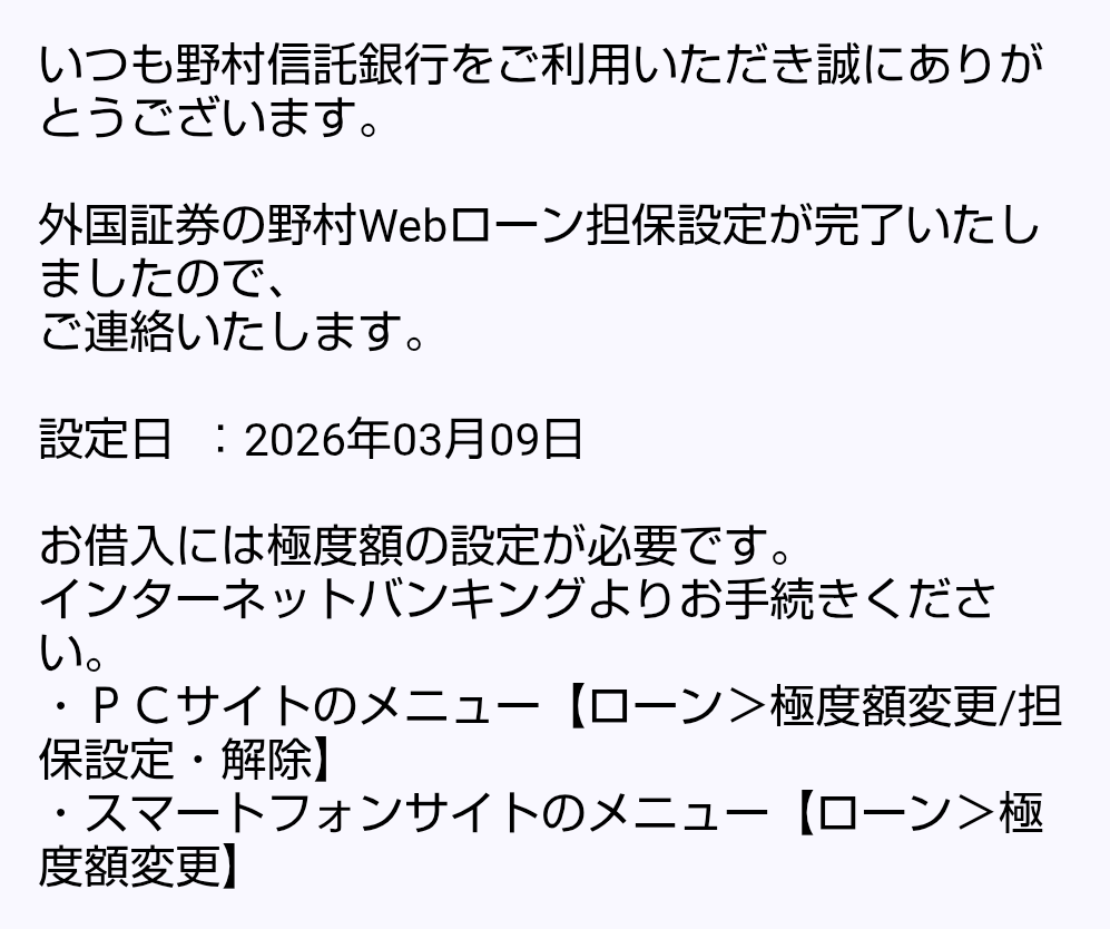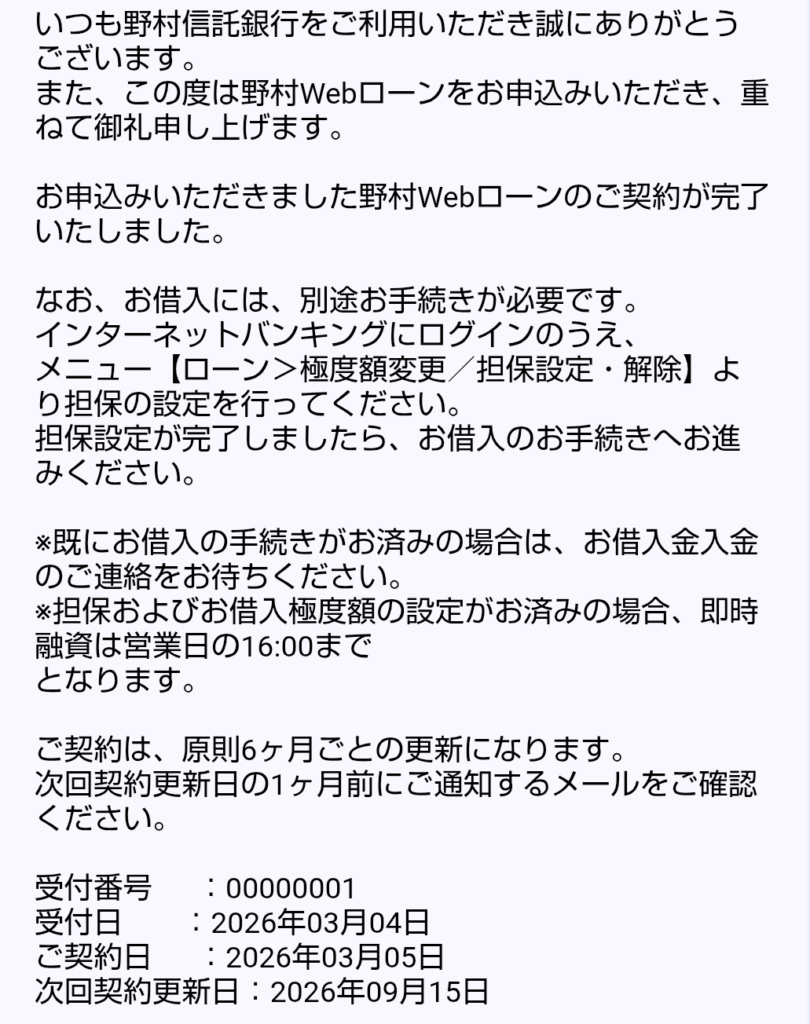こちらは前評判のとおり、2営業日程度で野村WEBローンの契約が完了しました。