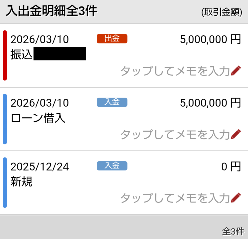 あとは実際に借り入れる金額(まずは実験的に500万円)を入力します。確か翌営業日には、野村證券口座に振り込まれていました。今回の借入金はTOPIXの投資信託に投資しました。野村證券で投資信託を購入すると手数料が高いので、再度SBI証券側の口座に送金し、SBI証券で投資信託を購入することとしました。