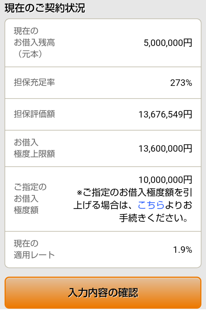 担保設定および審査が完了すると、担保設定に応じた借入限度額が表示されます。細かい設定(時価変動によって担保額の増減をどうするか等)もありましたが、キワキワまで借りるつもりはないので、とりあえず1000万円に設定しました。