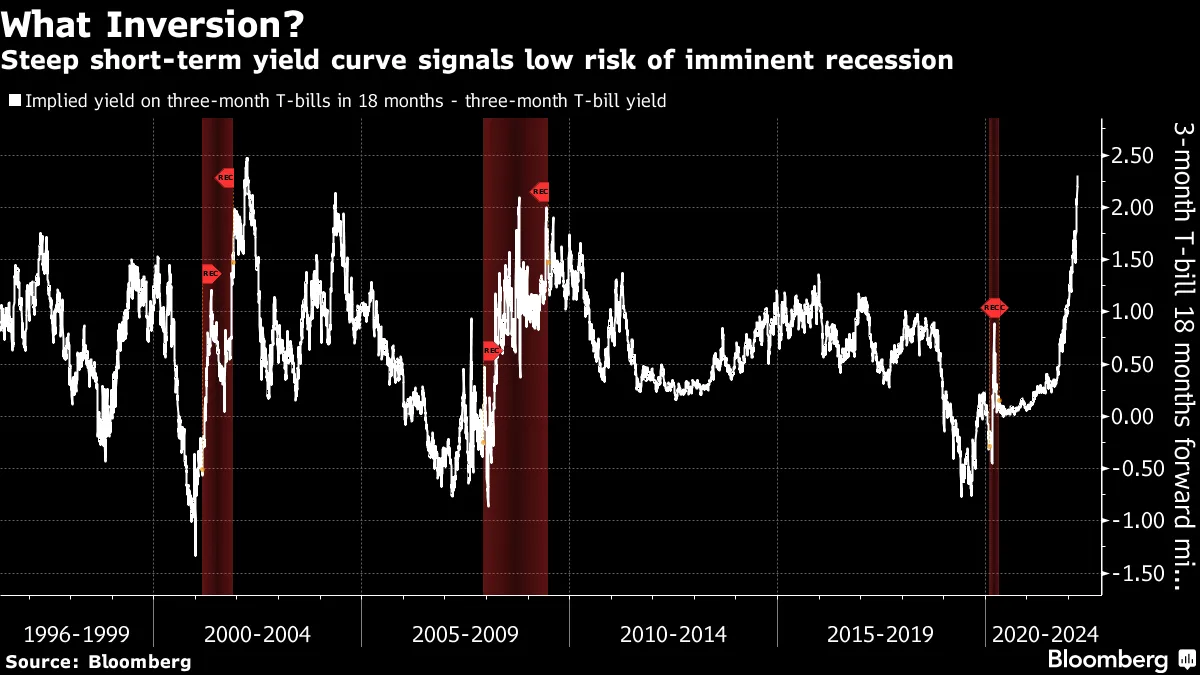 現在の3カ月物米財務省短期証券(Tビル)利回りと、フォワード市場から算出される1年半後の3カ月物Tビル利回りのスプレッド