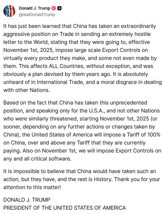 中国が貿易に関して極めて攻撃的な姿勢を示し、世界に向けて極めて敵対的な書簡を送付したことが分かりました。書簡では、2025年11月1日より、自国製品のほぼ全て、そして一部は自国以外で製造された製品にも大規模な輸出規制を課すと述べられています。これは例外なく全ての国に影響を及ぼし、明らかに中国が何年も前に考案した計画です。国際貿易においてこのような行為は全く前代未聞であり、他国との取引において道徳的に不名誉な行為です。