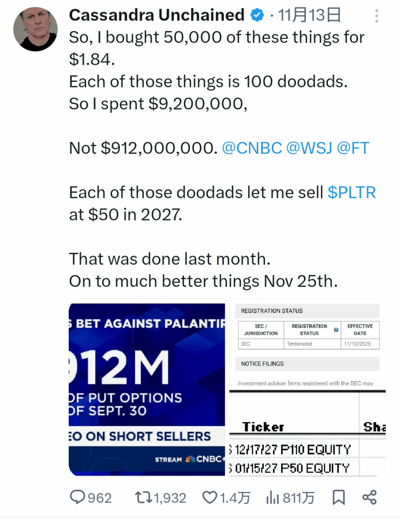加えて、バーリ氏はこの投稿で、パランティアに対する弱気ポジションの詳細を公表し、2027年に「50ドルで同社株を売却できる」オプションに約920万ドルを投じたと説明しました。