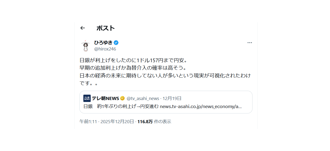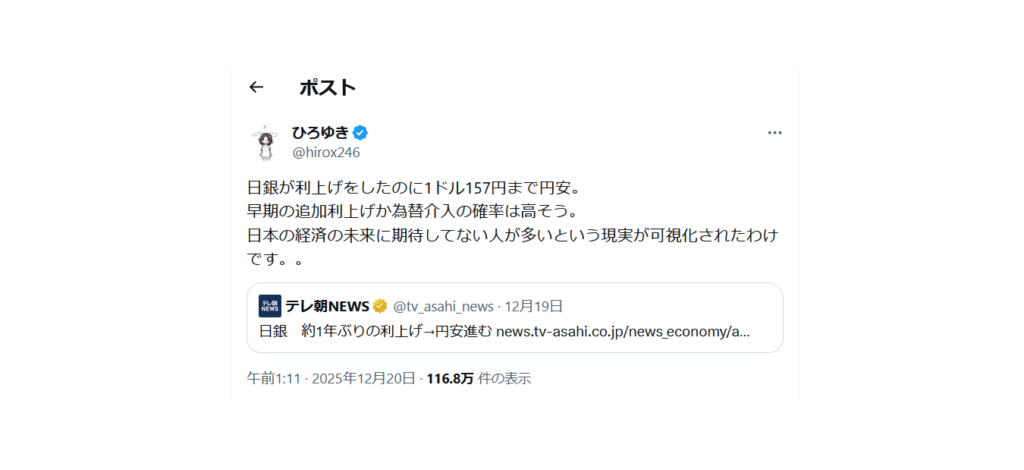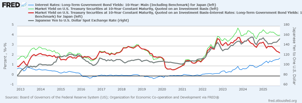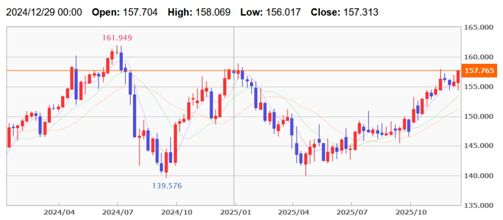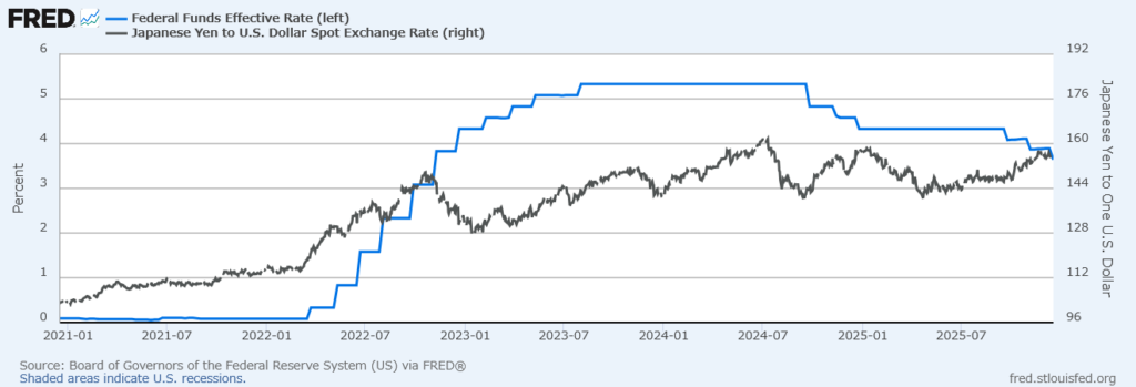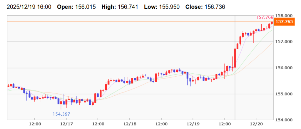 しかし、2025年12月に置いて米国は利下げ(12月10日)、日本は利上げ(12月18日)と金利差が縮小する政策決定にも関わらず、円安が進行しました。18日の政策(利上げ)発表直後は特段動きはなかったものの、植田総裁の記者会見に入ると円安が進行し、155円後半だった水準が一気に157円後半になりました。