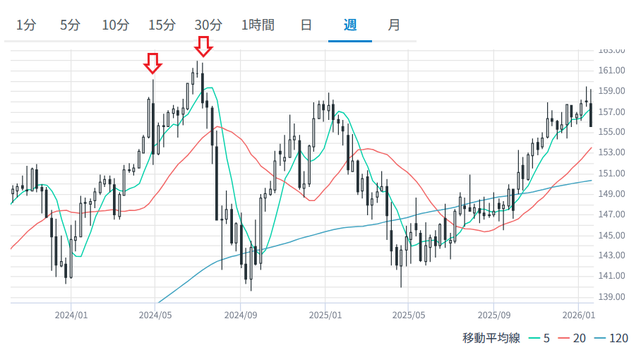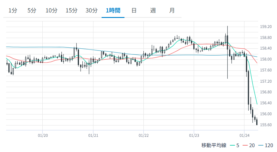 ドル円が大きく動きました。いつもどおり158円で推移していたものの、一度159円にタッチしたのもつかの間、1月24日を跨いだところから155円まで円高が進行しました。