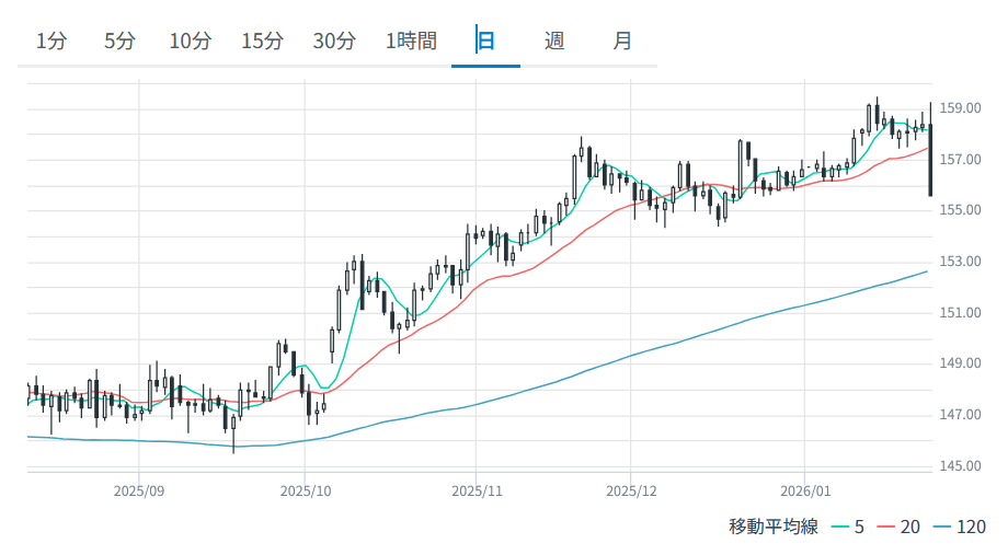 ドル円が大きく動きました。いつもどおり158円で推移していたものの、一度159円にタッチしたのもつかの間、1月24日を跨いだところから155円まで円高が進行しました。