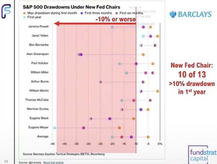 7,300到達後に訪れる可能性のある下落についても、具体的なデータを示しながら警告しています。その根拠となるのが、過去13人のFRB議長が新たに就任したケースのうち、10人が就任1年目にS&P500で10%以上の下落を引き起こしているというものです。現在のFRB議長はケビン・ウォーシュ氏(2026年就任)であり、このデータがまさに今に当てはまる状況にあります。