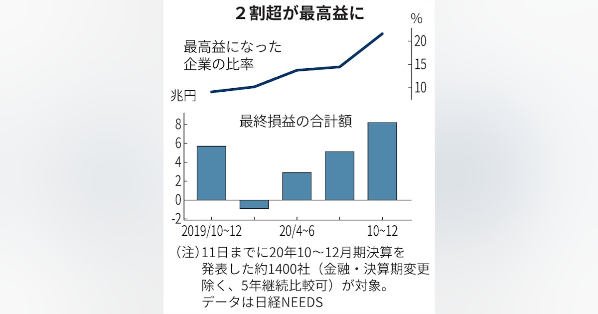 11日までに10~12月期決算を発表した3月期決算の上場企業(金融など除く)のうち、5年以上継続して比較できる約1400社の業績を日本経済新聞社が集計した。そのうち、302社の純利益が過去最高になった。