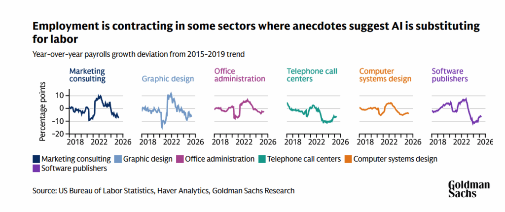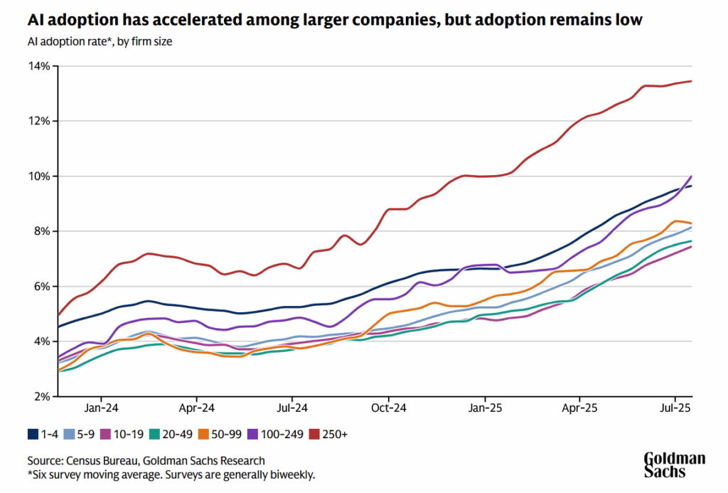AIの導入は大企業を中心に行われており、一方でその比率もそこまで高くないことから「こうした傾向は導入が進むにつれて広がる可能性があるが、AIが今後10年間で大規模な雇用削減につながるかどうかについては依然として懐疑的だ」とゴールドマン・サックスのエコノミストは主張しています。