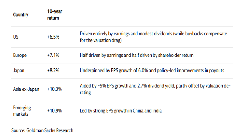 米国のベースライン予測はレンジの中央に位置しており、これは現在のバリュエーションの高騰と市場集中による下振れリスクと、米国株式市場が成長イノベーションのグローバルハブとして、そして高品質企業の優先上場市場としての役割を強化する可能性の両方を反映しています。