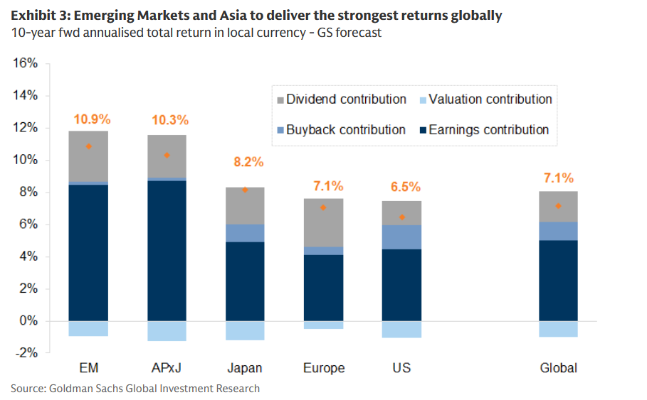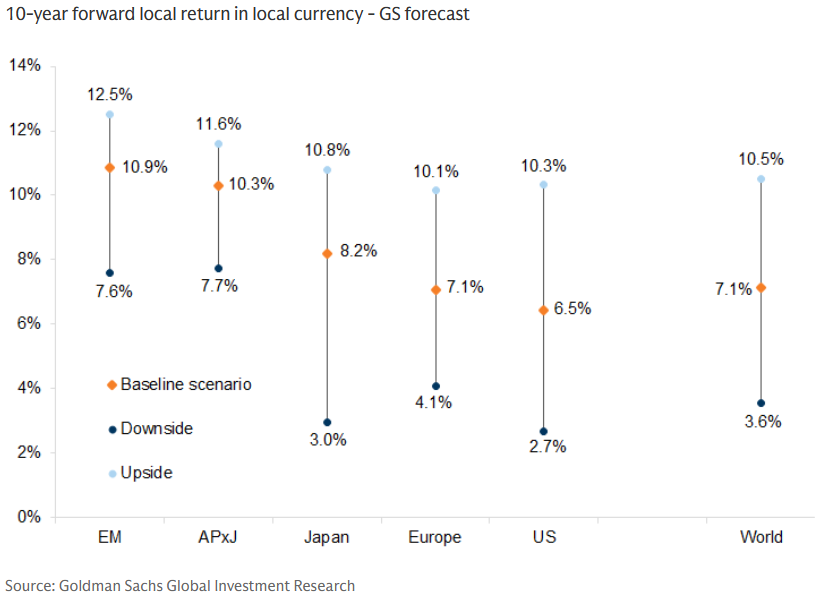 ゴールドマン・サックス・リサーチのチーフ・グローバル株式ストラテジスト、ピーター・オッペンハイマー氏による世界の株式は今後10年間のリターン予測です。世界の株式は今後10年間、米ドル建てで年率7.7%のリターンを得ると予測されています。
