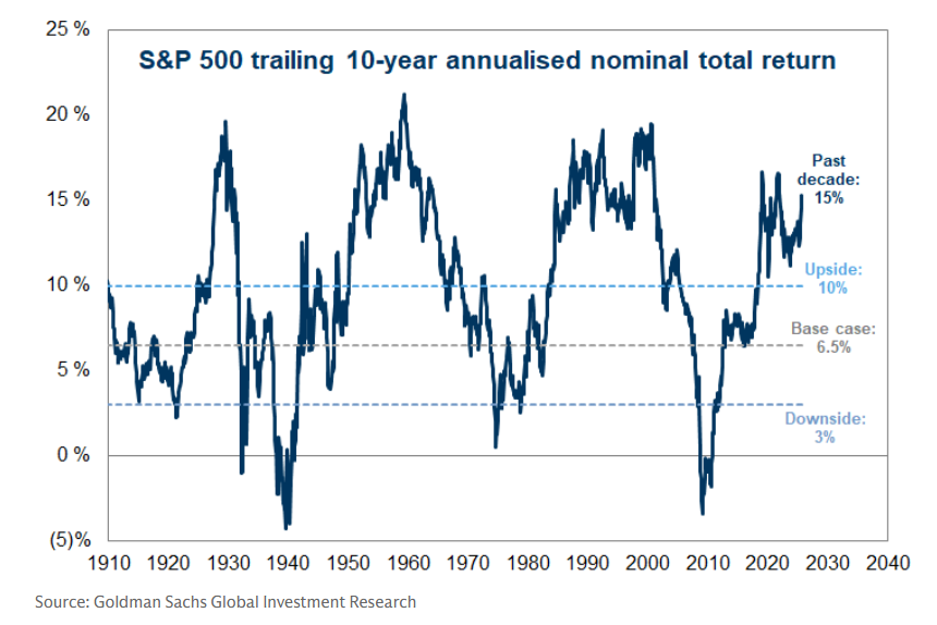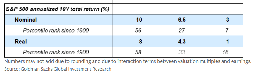 6.5%のリターン予測の構成要素は、1株当たり利益(EPS)成長が6%、バリュエーション低下がマイナス1%、そして配当利回り1.4%とのことです。バリュエーションの低下が気になるところですがリターンそのものの主な原動力は利益であり、例えば1990年以降、EPS成長率はS&P500指数の年率9%の名目株価リターンの8%を占めています。