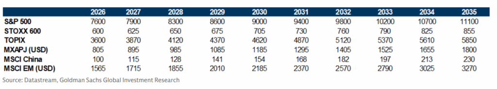 当社の世界株価予想のベースラインは、極端なショックや楽観的な見通しを織り込まず、概ね良好な状況を想定しています。深刻な不況や主要な地政学的危機といった大規模で持続的な混乱は除外しています。また、AIによる生産性や収益増加は明示的にモデル化していませんが、当社のエコノミストの長期GDP予測をモデル化に使用しており、結果的にAIテクノロジー主導の成長も考慮されていることになります。