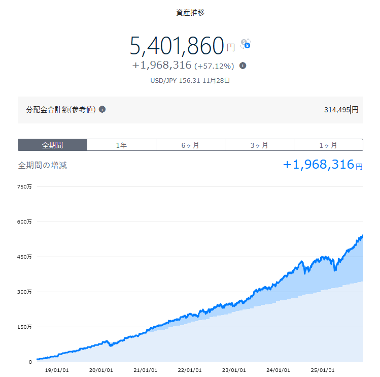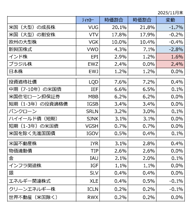 今回減少した新興国株式(VWO)の構成比率は中国・台湾で55%を占めているようです。(2025年10月末時点)そのため、インドとブラジルに特化したということは、新興国市場は投資妙味がある一方で中国周辺情勢に懸念があるという見方なのでしょうか。