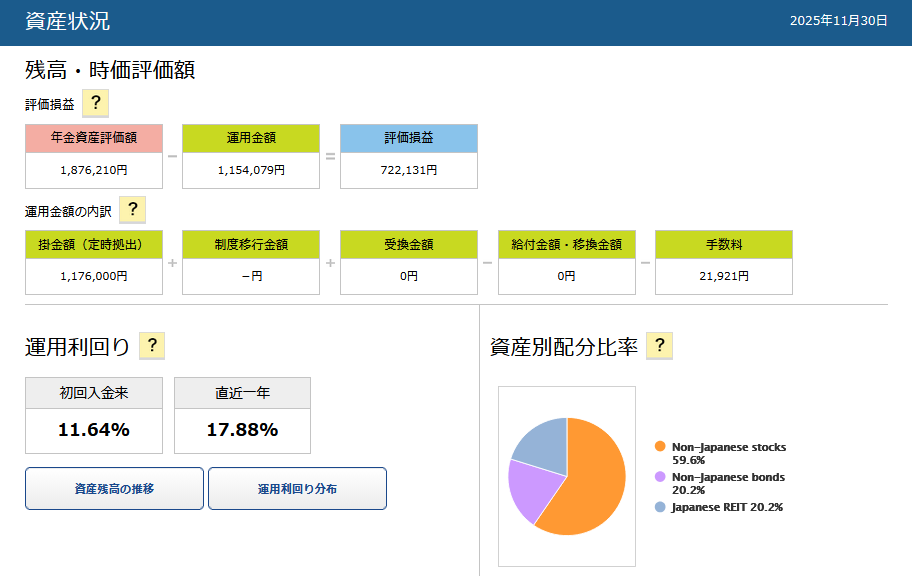 今年も残すところあと1か月となりました。と毎月12,000円積立てているidecoと、毎月30,000円積立ているのTHEOの運用実績を確認していきたいと思います。