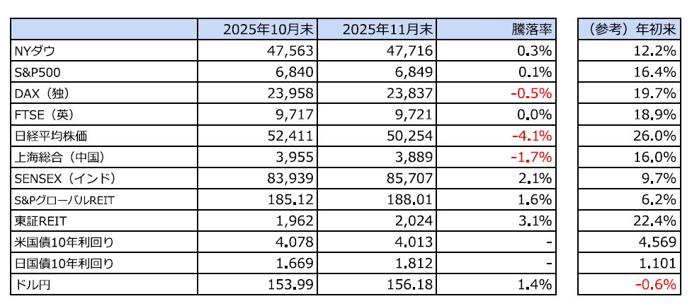 米国では政策金利引き下げ期待の高まりから、日本では財政出動の拡大とガソリン減税など物価抑制策が決まり業績回復期待から株価が上昇した銘柄もあったものの、一部AI関連銘柄のバリュエーションの高止まりによる警戒感からハイテク株が下落しました。