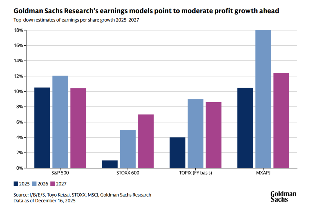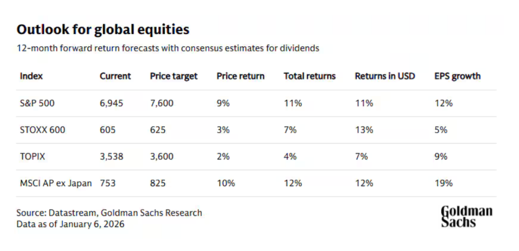 “Consequently, we think that returns in 2026 are likely to be driven more by fundamental profit growth rather than by rising valuations,” Oppenheimer writes. Our analysts’ 12-month global forecasts indicate equity prices, weighted by regional market cap, are expected to climb 9% and return 11% with dividends, in US dollars (as of January 6, 2026). “Most of these returns are earnings-driven,” he adds.